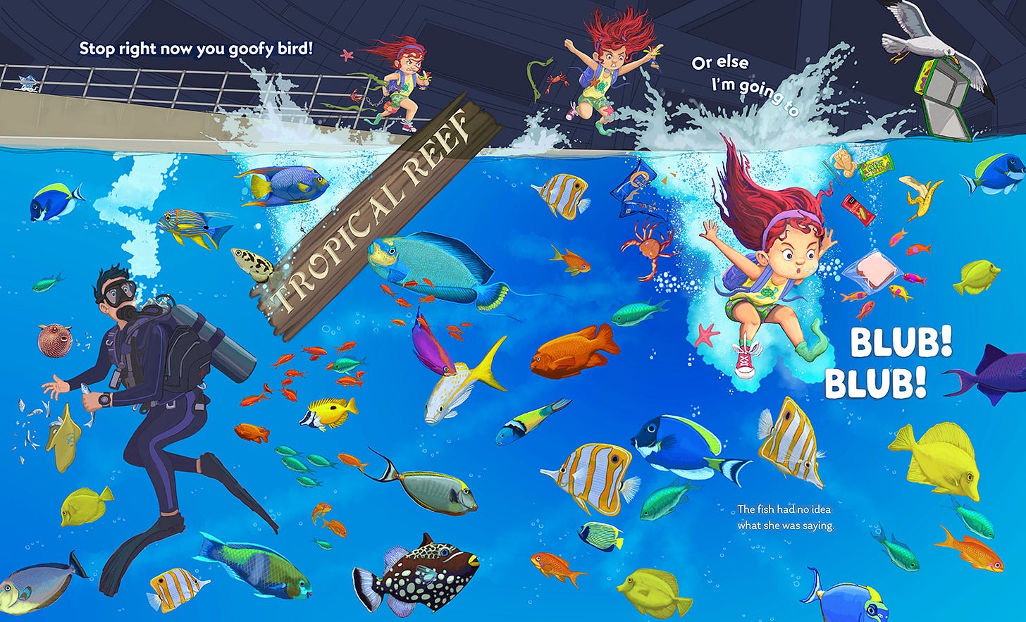 Aside from the other main character, Mr. Gilley, the majority of the work came from building a world of ocean animals that were both friendly and representative of what marine life truly looked like. This required months of research to find all the animals I wished to introduce, while making decisions about what fish were not right for the story. I spent a considerable amount of time debating whether or not to include sharks in the mix, for fear of scaring young readers with the notion that Rosie would be eaten if she jumped in the tanks. In the end, I aimed to deliver a fun universe of creatures that either didn’t seem bothered by Rosie’s intrusion or adapted to the chaos in a way that wasn’t distracting to the story.